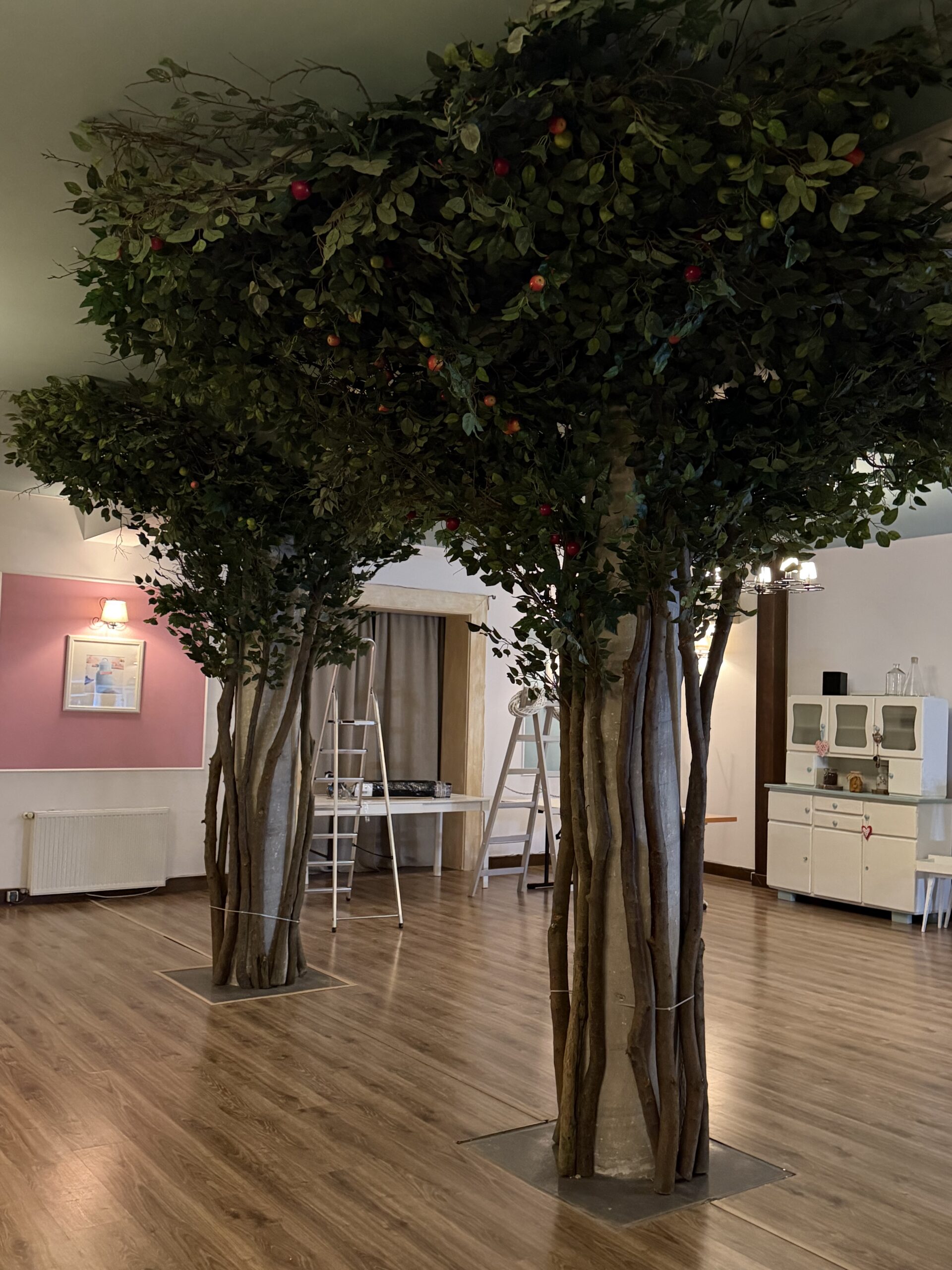 Drzewo jabłoni 280cm wysokości i Korona na 5m2 z owocami z koroną na suficie. Zrobimy takie drzewo w każdym rozmiarze. Może być w innym kolorze, z innymi kwiatami, liściaste, iglaste itp.