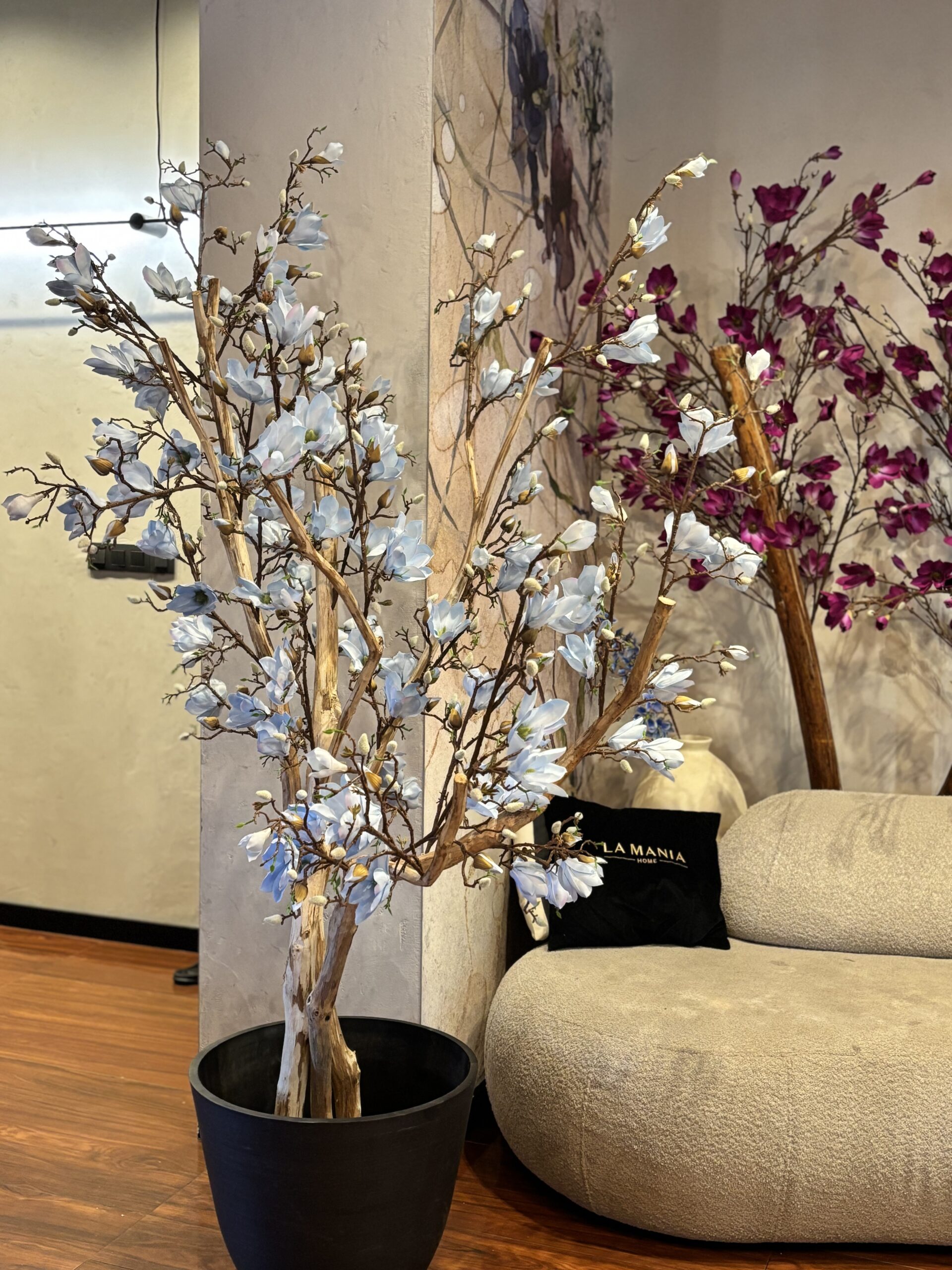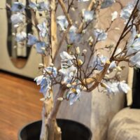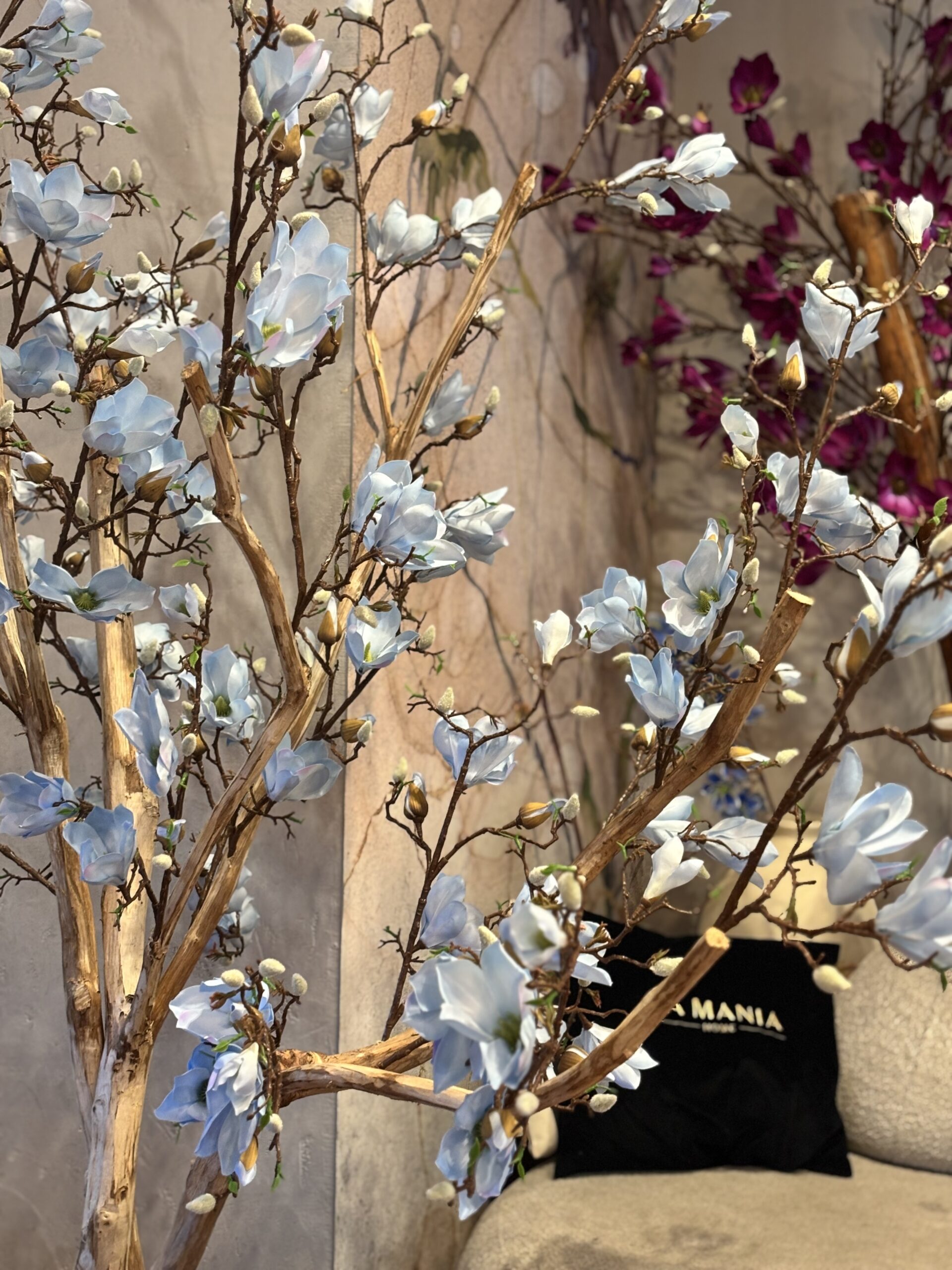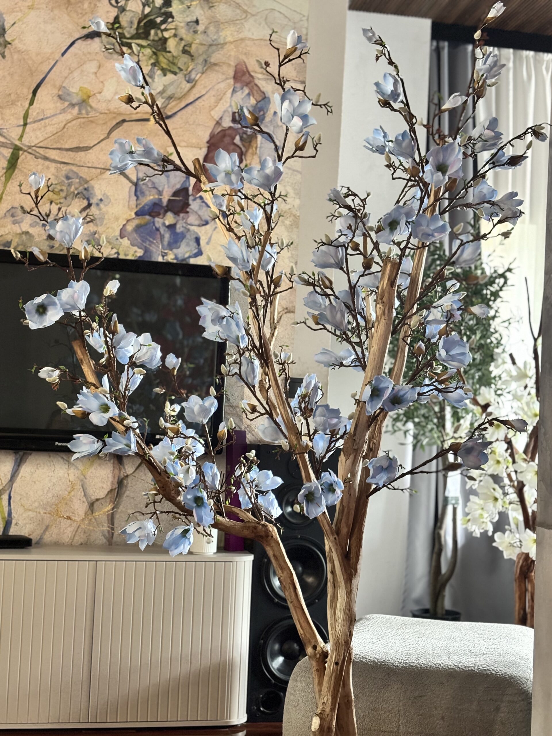 Magnolia w kolorze baby blue 200cm na naturalnych pniach, które zostały pozbawione kory. Przepiękny błękit kwiatów idealnie współgra z jasnym pniem.