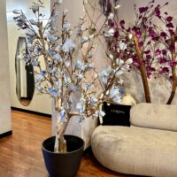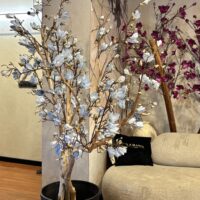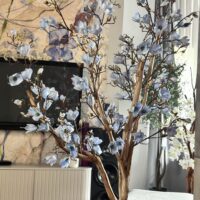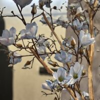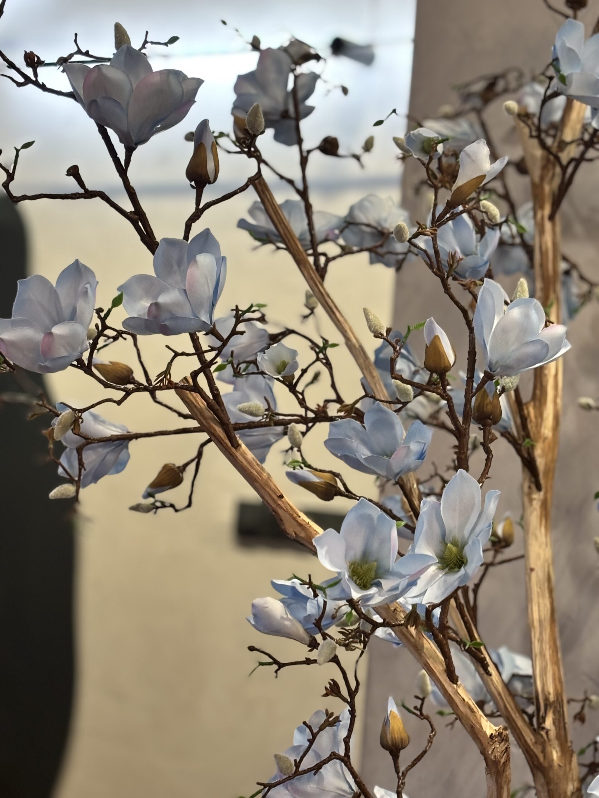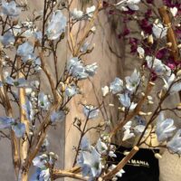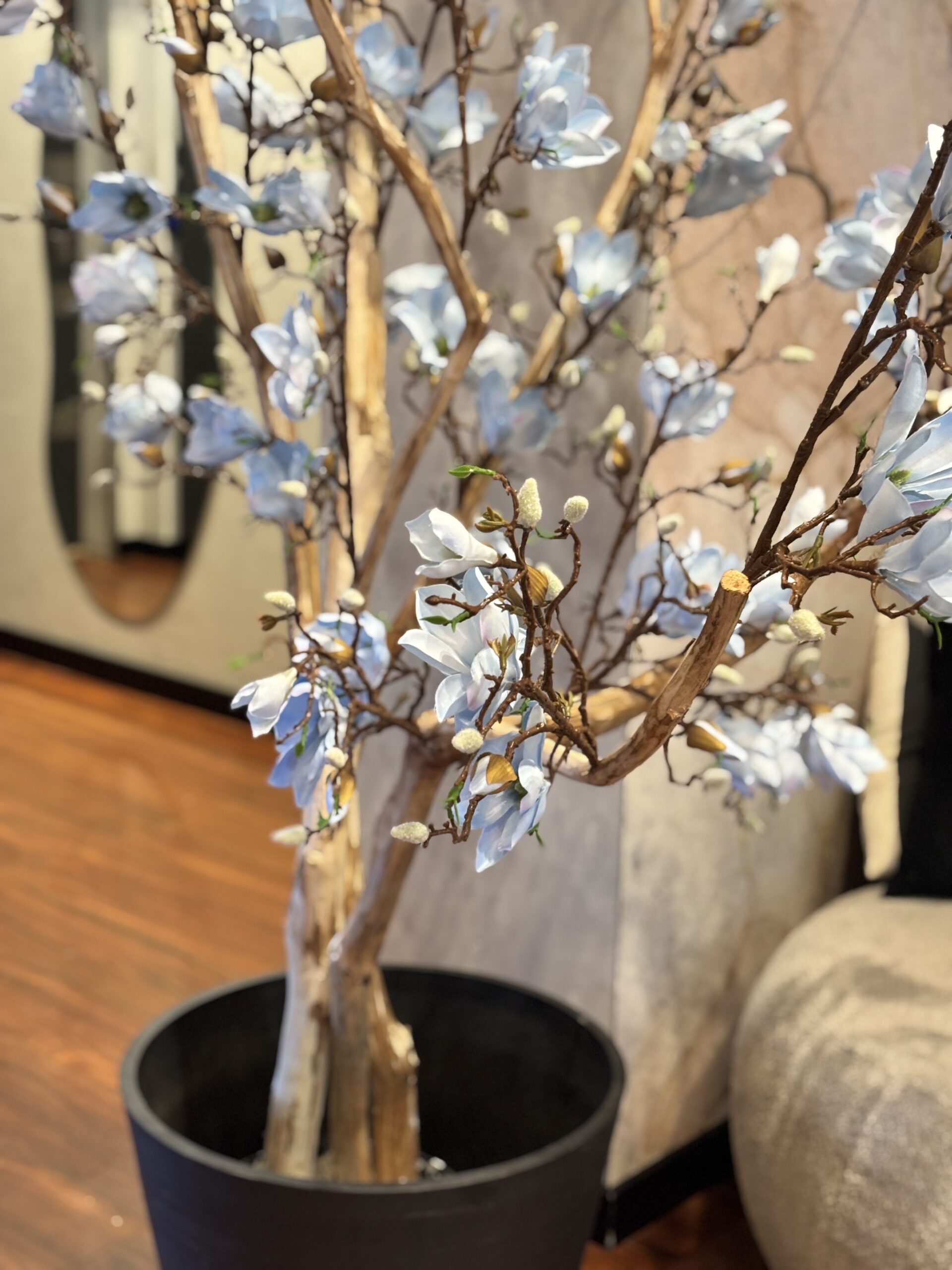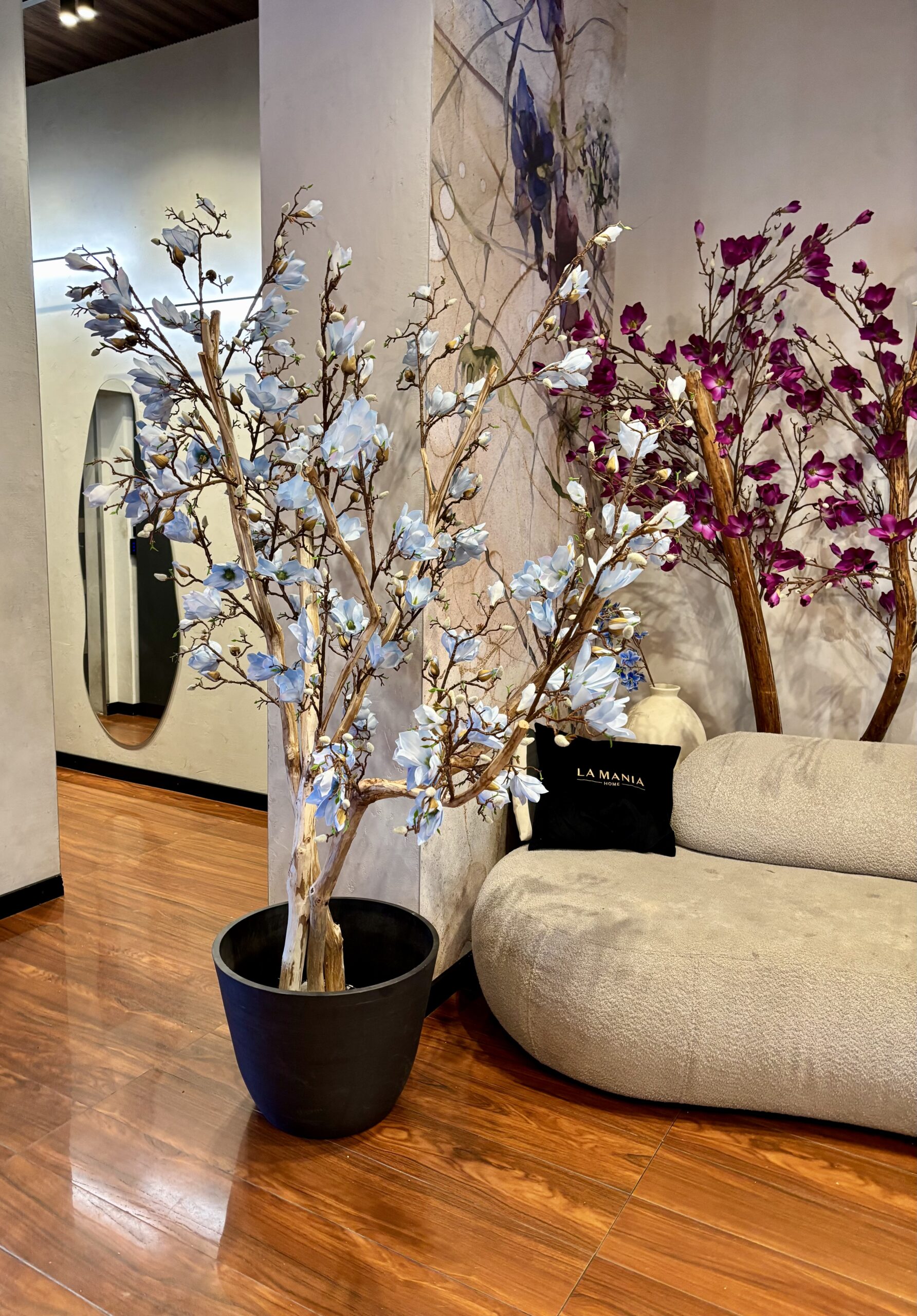 Magnolia w kolorze baby blue 200cm na naturalnych pniach, które zostały pozbawione kory. Przepiękny błękit kwiatów idealnie współgra z jasnym pniem.
